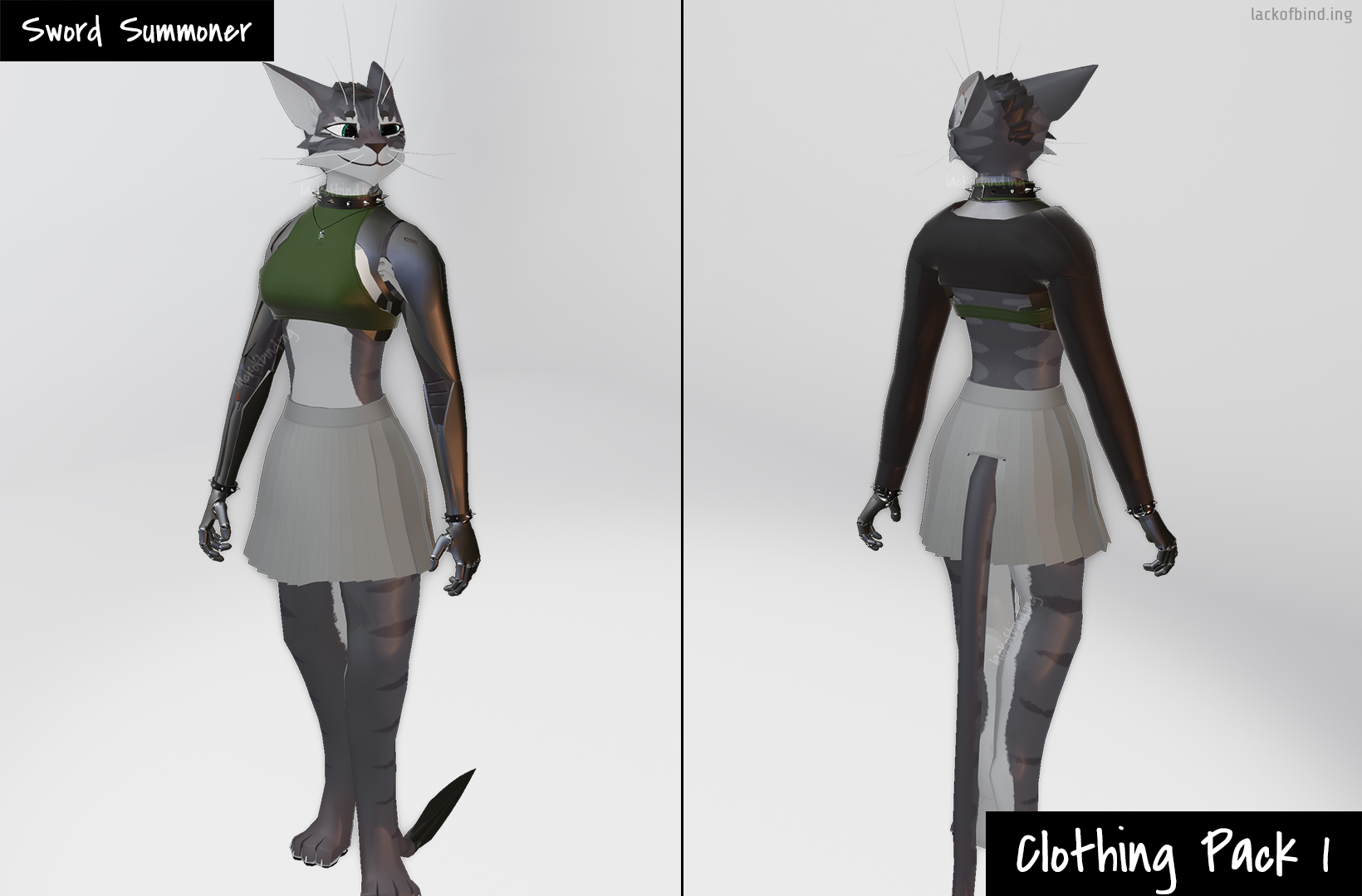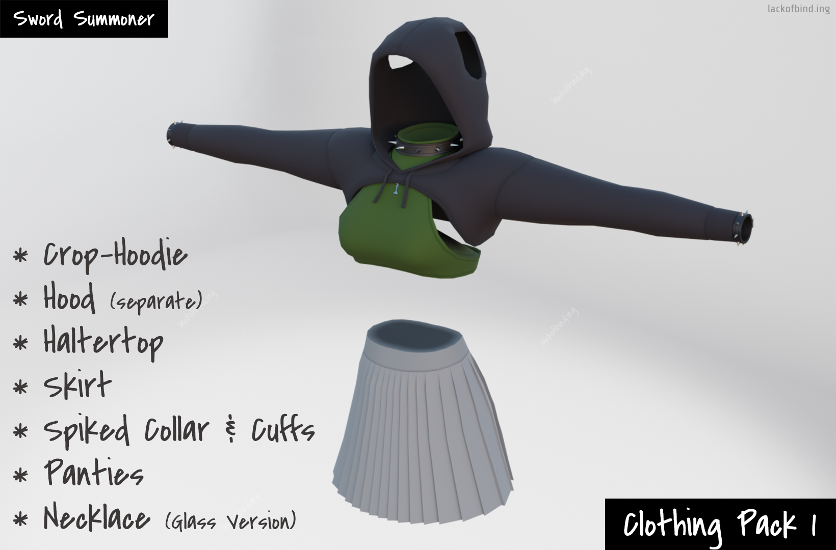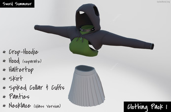 This Clothing pack includes a new Crop-Hoodie, Skirt, Haltertop, Spiked Collar and Cuffs, and a Glass version of the Necklace, for the Sword Summoner.